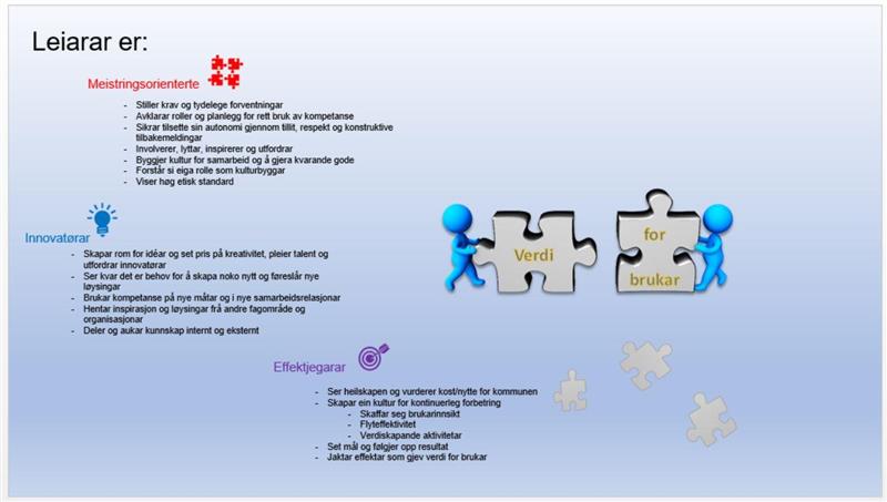 Godt leiarskap er avgjerande for å levera gode tenester til innbyggjarane. Leiarar i Kvam herad skal leggja til rette for meistring, innovasjon og kontinuerleg forbetring.