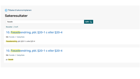 Til dømes: Fasade.Fann den det du leita etter klikk på den aktuelle lenka. Då kjem du til gebyrlista og den syner deg ned til det punktet du har søkt på. Det kan av og til ta nokre sekund frå du kjem til sida for gebyrlista til du vert sendt ned på punktet du søkte etter.